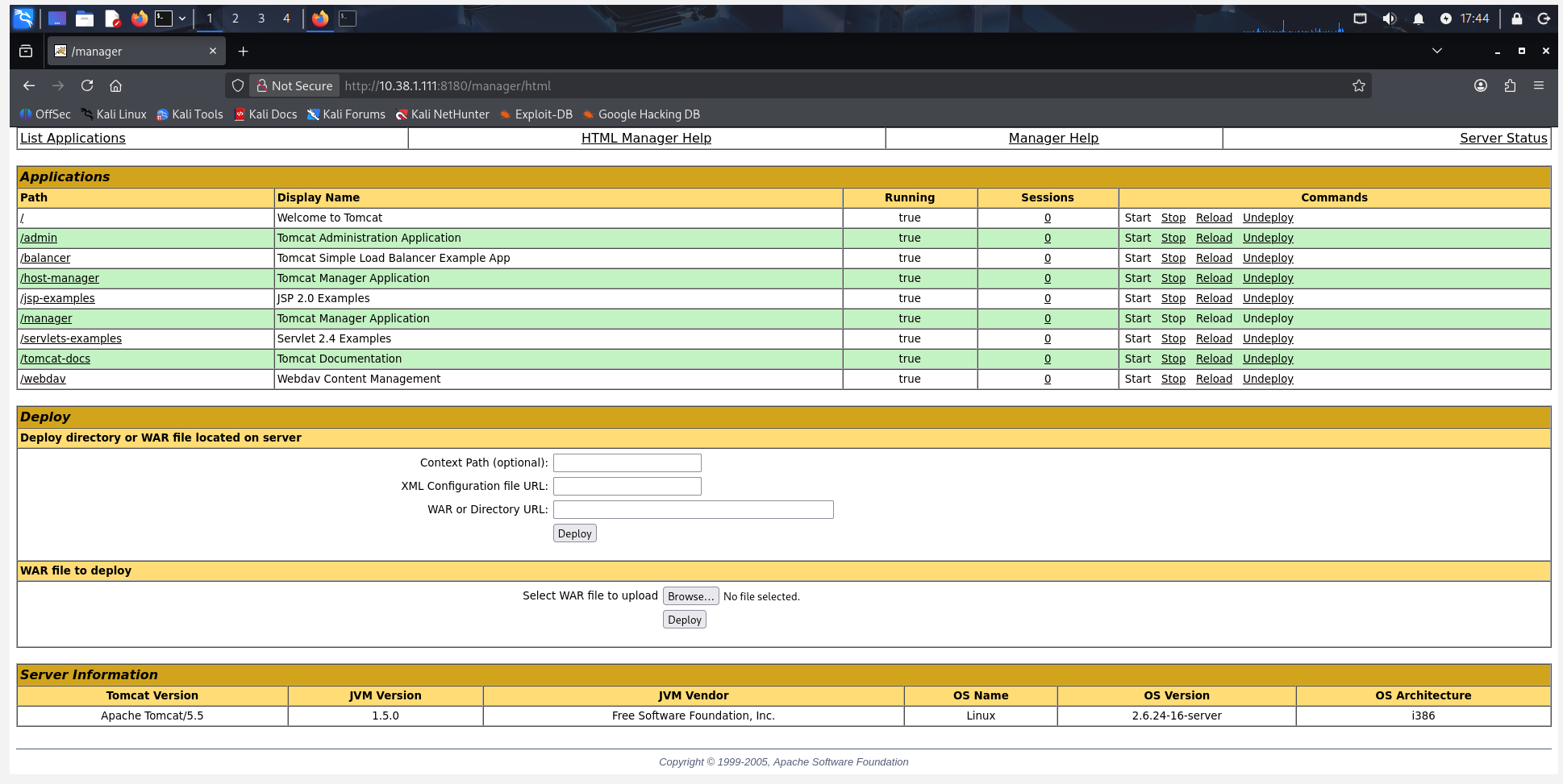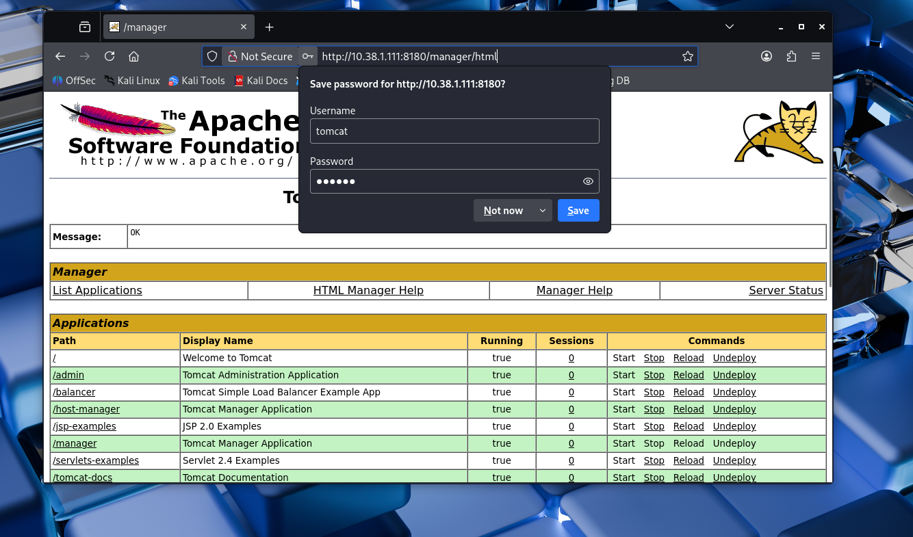 Accessed the manager interface and logged in using default credentials, gaining admin control.